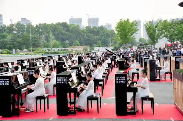 在洛阳师范学院音乐学院院长商立君和洛阳市钢琴协会会长裴航领奏下,百名琴童合奏《红旗颂》,拉开了演奏会的序幕。随后由洛阳市知名歌手王真真、何磊、韩江珊,主唱的《唱支山歌给党听》、《灯火里的中国》两首动听的歌曲,生动表达了歌唱者与演奏者对党和祖国的无限热爱之情。最后全区各部门代表、合唱演员、百名琴童、在百台博林达姆BALLINDAMM钢琴的伴奏下,由全场群众齐声高歌《没有共产党就没有新中国》中将活动推向高潮。