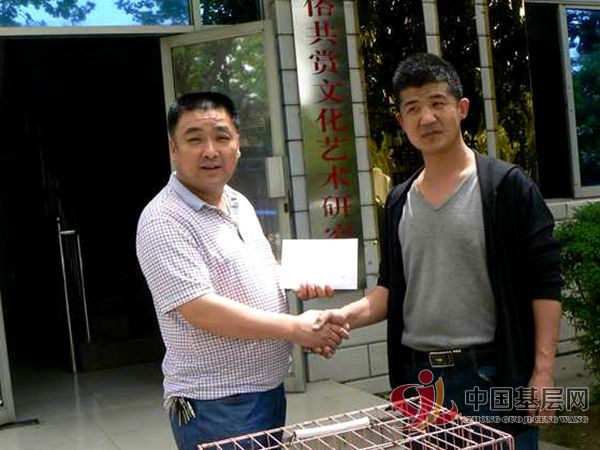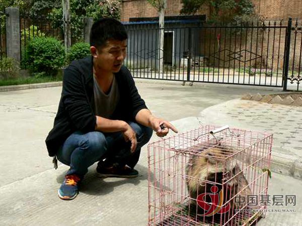 洛阳雅俗共赏文化艺术研究院院长邢战国【左】向洛阳市周山森林公园野生动物救助站工作人员捐献国家保护动物:貉