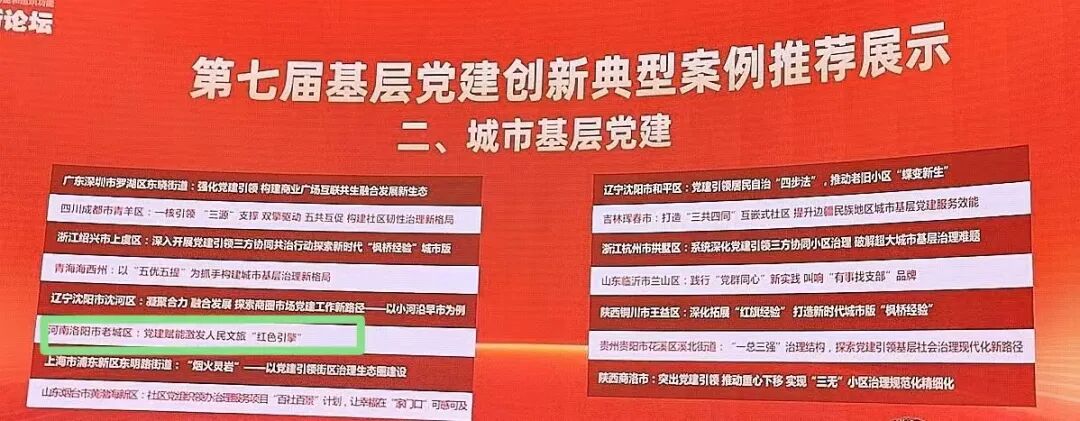 近日,由中国浦东干部学院、中国共产党新闻网联合举办的第七届基层党建创新论坛在北京举办。论坛发布“第七届基层党建创新案例库”,并对126个典型案例进行重点推荐,洛阳市老城区报送的《党建赋能激发人民文旅“红色引擎”》案例从全国征集到的3300多个案例中脱颖而出,获评第七届全国基层党建创新典型案例。这是我市唯一获此殊荣的案例。