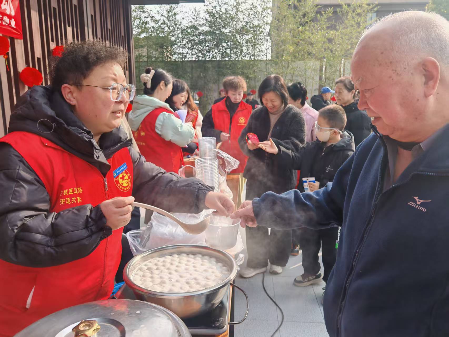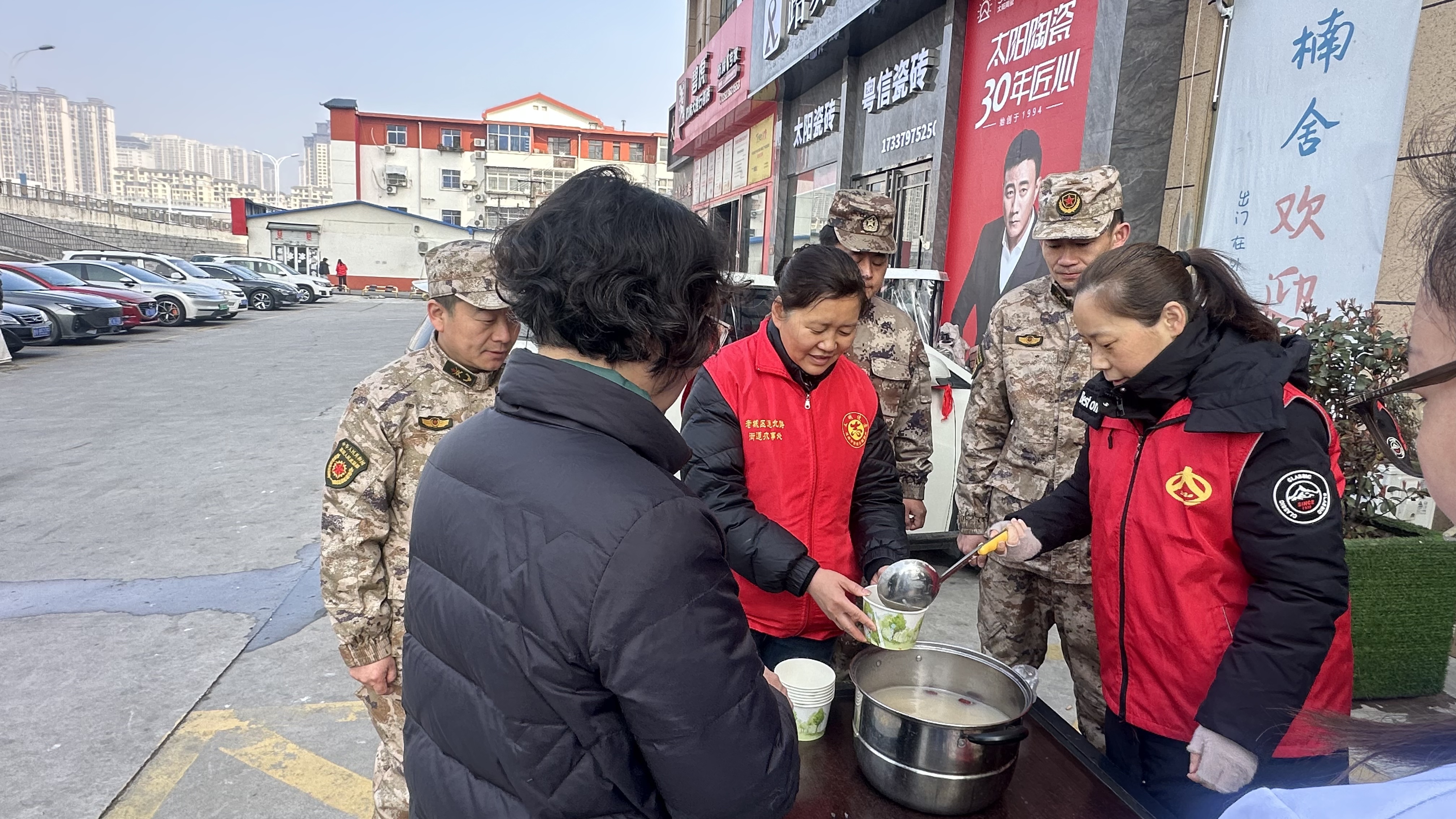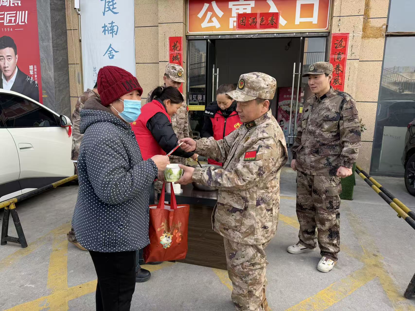 活动现场氛围庄重而热烈,红灯笼高高悬挂,处处洋溢着节日的喜庆气息。辖区建筑电子屏循环滚动“元宵暖兵心”“双拥情意浓”“学习雷锋日”等宣传标语,将传统节日文化、雷锋志愿精神与双拥工作要求有机结合,进一步营造了“军爱民、民拥军,军民团结一家亲”的浓厚社会氛围。道北路街道人民武装部专武干部、民兵骨干、医护工作者及社区志愿者组成专项服务队伍,有序开展各项服务工作,确保活动取得实效。